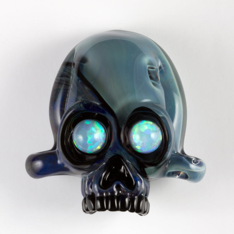 Northstar Alaskan Thunder is a black blue silver color. When worked in an oxidizing flame, Northstar Alaskan Thunder yields bright metallic blues, greens, and purples. When worked in a neutral flame it yields bright hazy green, white, and cream colors. When worked in a heavily reducing flame, Northstar Alaskan Thunder produces a nice ash gray. It is well suited for stringer application, blown work, and sculpture. Try encasing Northstar Alaskan Thunder with clear or Northstar Yellow for great effects.