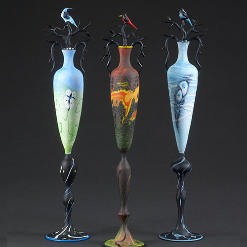 Shane will show you how to blow a bird in soft glass and introduce you to adding color. "We must think of the coloration of our glass as a form of painting in that we can apply color in stages with layers of powders, frits, shards and canes to create tonal qualities as well as shades to achieve our results. The viscosities of the particular chemistries of glass add an extra problem or resolution to our results. It can be challenging, but also rewarding to experiment and bring about new effects and colors. "Finally Shane will finish off his bird by creating and tweaking the very refined feet of the bird.